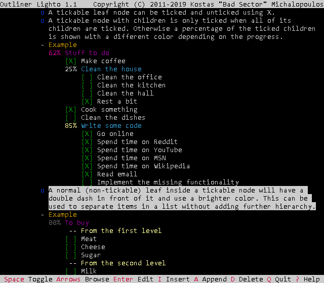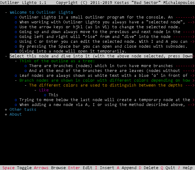 Outliner Lighto comes with documentation in the form of man pages in the source code distribution and the Linux and Haiku binaries as well as their HTML conversion in all binaries. It also has a scripting reference (only for Outliner Lighto specific functionality) in all versions and the program itself has a simple key reference screen.